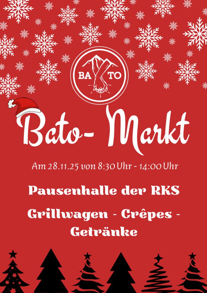 Am 28. November sorgen wir mit unserem Batomarkt wieder einmal für vorweihnachtlichte Stimmung. Der Markt wird um 8:30 Uhr für die Schüler und Lehrkräfte der Robert-Koch-Schule geöffnet sein und nach Schulschluss, um 13:10 Uhr, für die Öffentlichkeit. Wir würden uns freuen Sie an diesem Tag bis 14.00 Uhr hier an der RKS willkommen zu heißen.